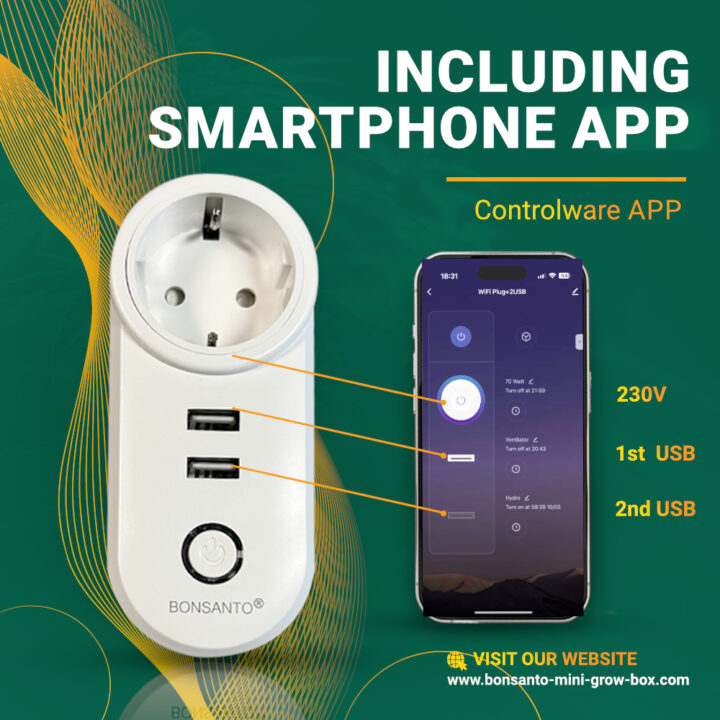 Grafik mit der Bonsanto Smart Steckdose inklusive Smartphone App