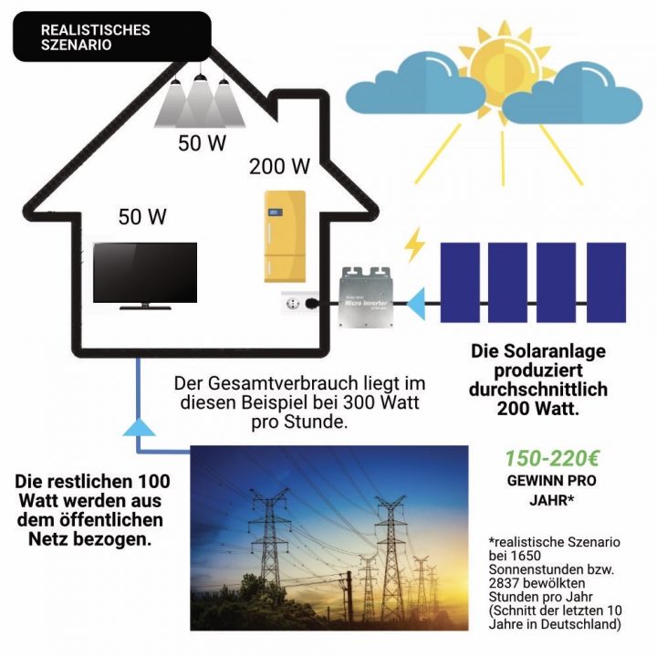 Die Solaranlage produziert Strom, sobald die Sonne scheint, und speist diesen direkt in die Steckdose. Deine Verbraucher (Lampen, Kühlschrank, TV etc.) nutzen zuerst den Strom von der Solaranlage. Den restlichen Strom beziehen die Verbraucher aus dem öffentlichen Netz. Wenn du einen alten Stromzähler besitzt, kann dieser sogar rückwärts gedreht werden, wenn zu viel Strom produziert wird. Bei den neuen digitalen Zählern ist dies jedoch nicht möglich.