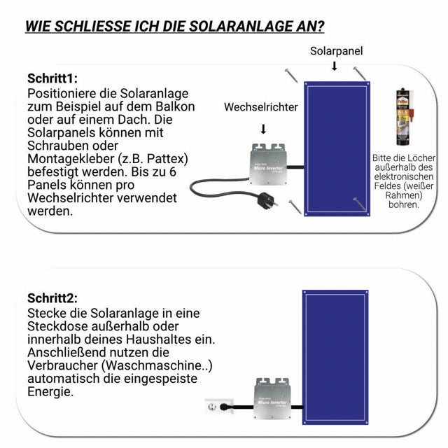 Befestigen Sie die Solaranlage mit Schrauben, Winkeln, Montagekleber oder liegend an einem Platz mit möglichst viel Sonne (zB Außenbalkon, Carport, Rasen, Dach, Garage). Die Solarpanels werden einfach per Steckverbindung mit einem Wechselrichter verbunden. Aus dem Wechselrichter kommt ein 230V-Kabel, das in eine Steckdose in deiner Wohnung oder deinem Haus (zB Außensteckdose) gesteckt wird.